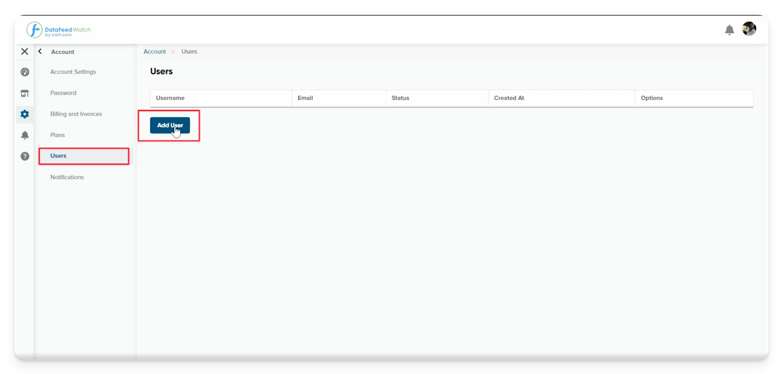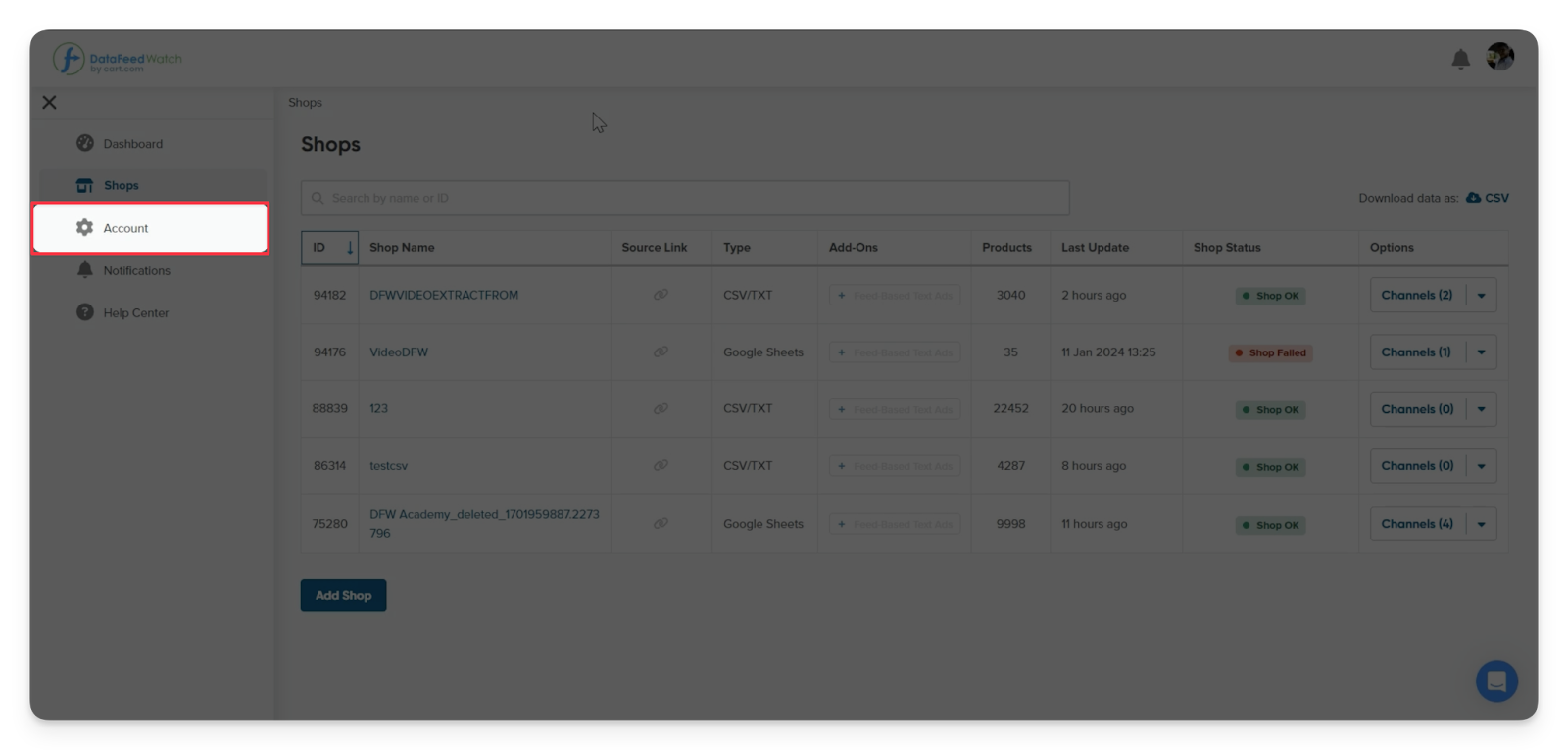 1 | Log in to your company DataFeedWatch account. Navigate to Account in the left menu | ![]() |