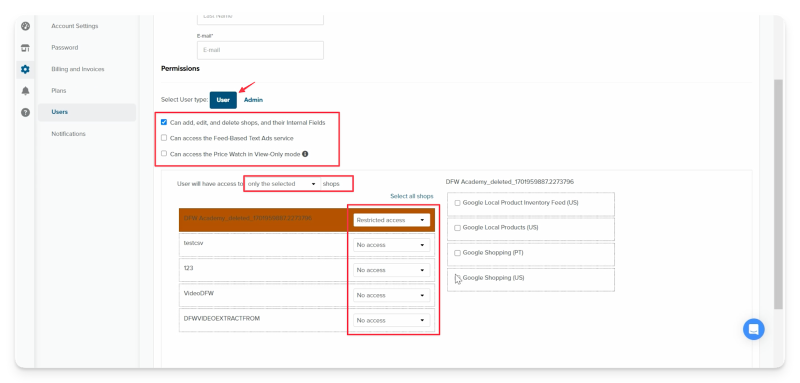 * | OPTIONAL: If you have multiple shops, you may wish to only provide us with limited access. You can customise our level of permissions by selecting Users instead of Admin, and choosing what you would like us to only have access to by ticking the boxes and selecting ‘only the selected’ shops. Choose between Restricted Access, No Access, or Full Access for specific shops. Then tick which Channels those would apply to (ex. Google Shopping, Google Local Products, etc.). | ![]() |