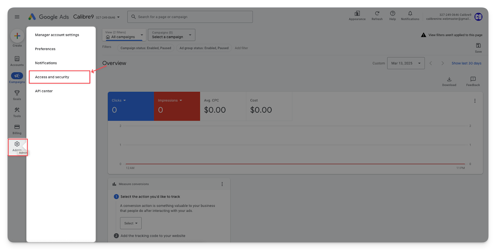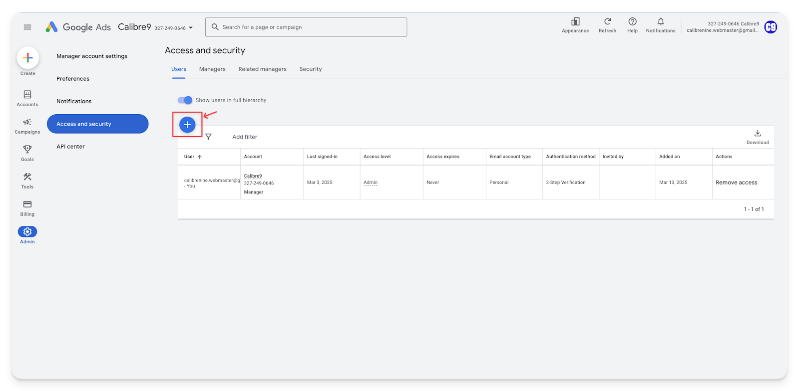 1 | Go to https://admanager.google.com/ and log in to your account. Navigate to Admin, then Access and security. | ![]() |