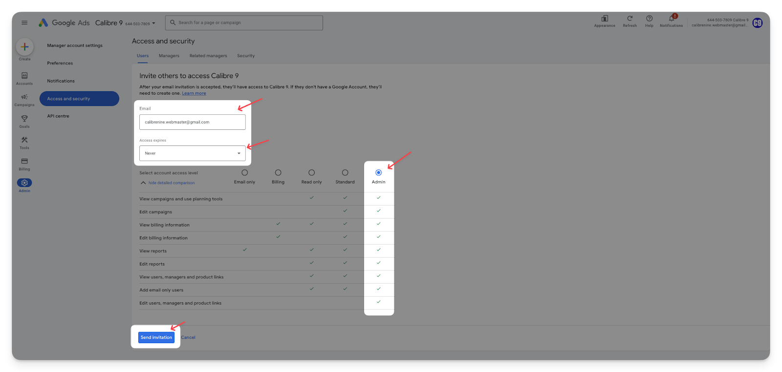 3 | Enter our email: calibrenine.webmaster@gmail.com and set the Access Expires to Never. Select the Admin permissions. Hit Send Invitation. | ![]() |