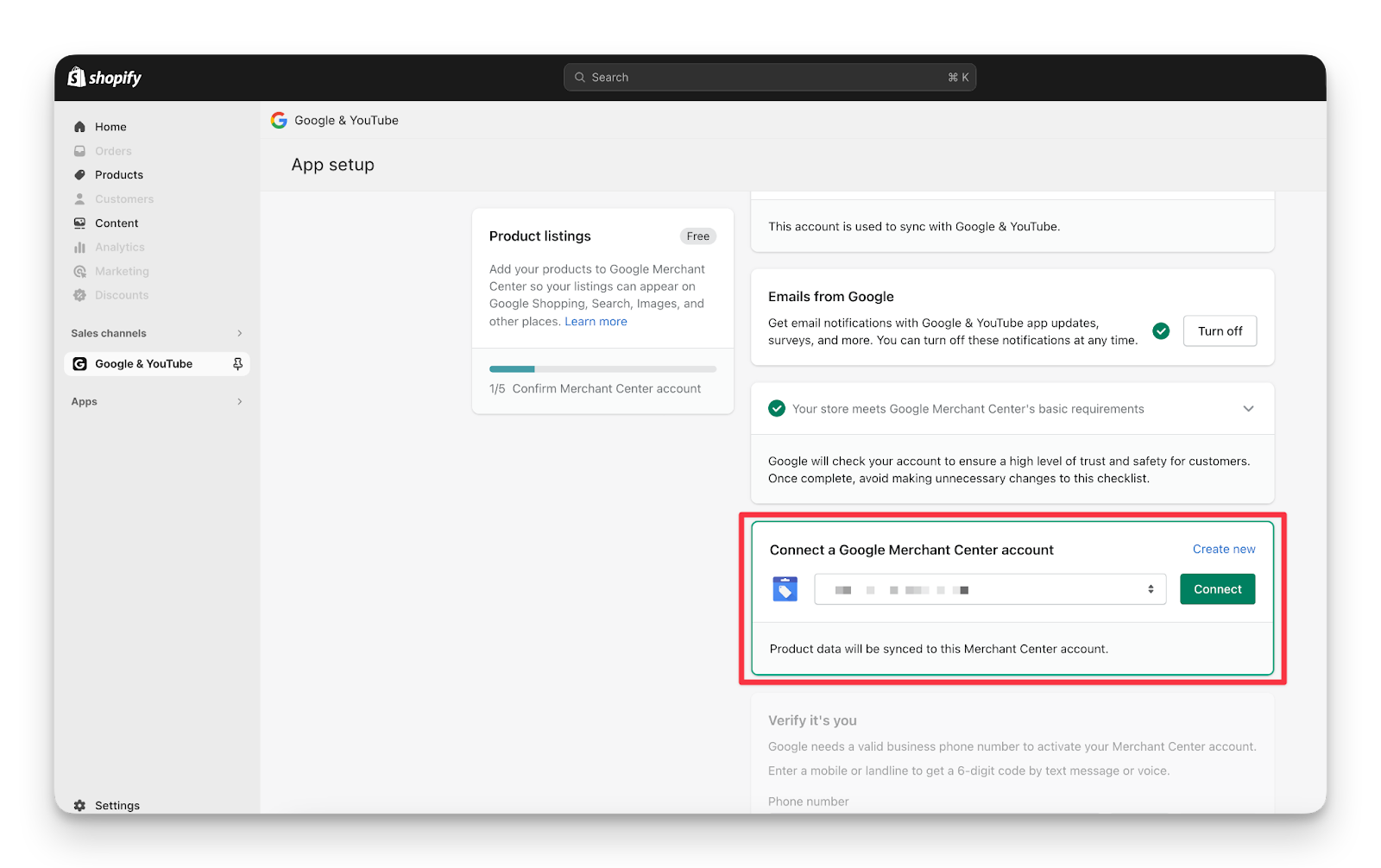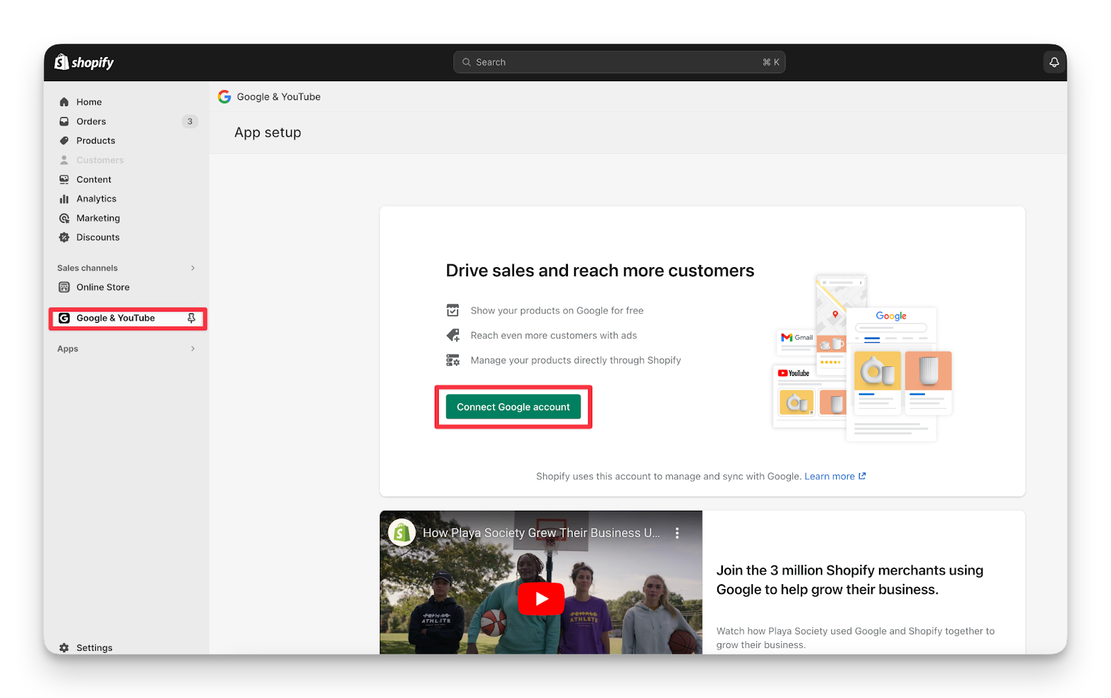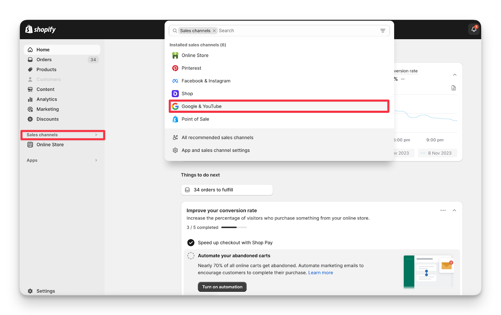 1 | Log in to your company Shopify account Go to your Shopify admin channel > Select "Channels” > Add sale channels > select "Google & Youtube" | ![]() |
