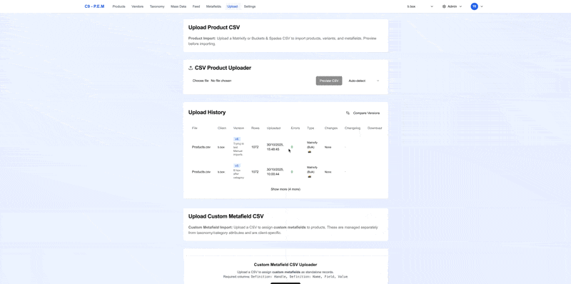 1 | Navigate to the P.E.M. Tool Upload tab. We want to make sure we have the latest export of the Products and the Metaobjects. This is how to do it: | ![]() ![]() |