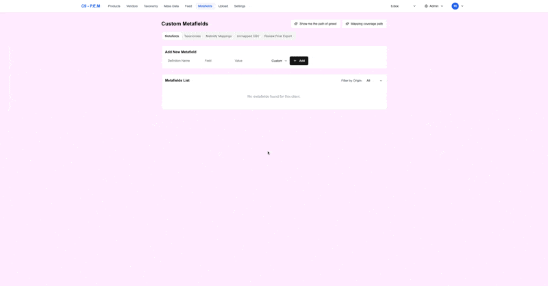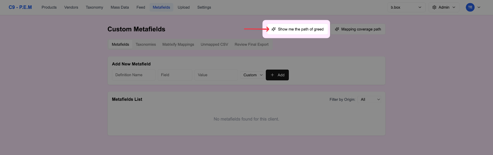 2 | Once you have those successfully imported, navigate to the Metafields tab and click Show me the path of greed | ![]() |