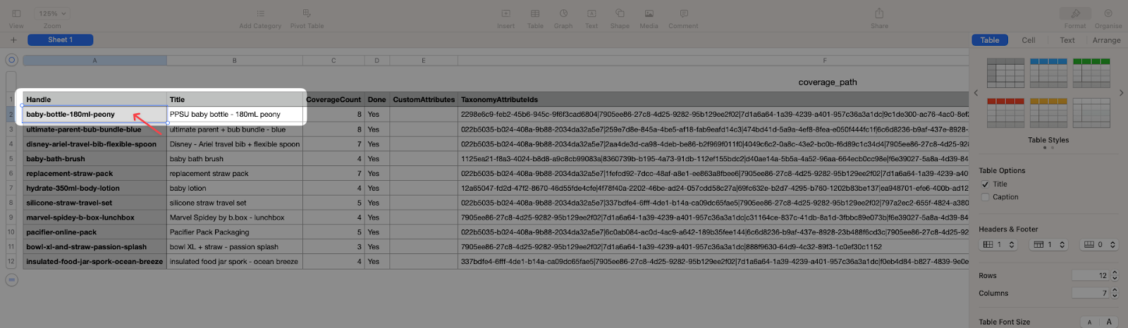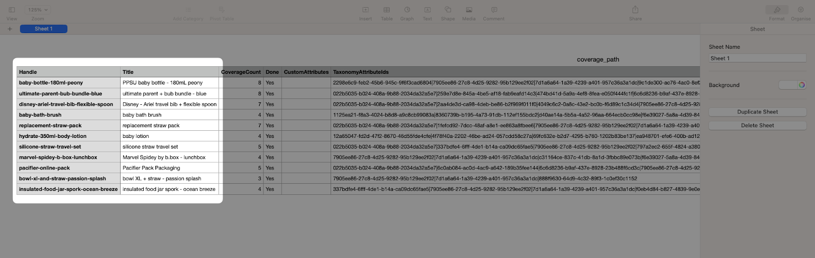 3 | This will generate a list of the most minimal product set that would cover all of the metaobject attributes. You can click on the Details button to inspect what particular ones each product is able to cover. When you’re happy with the list, click Select All then Export CSV. You’ve just generated your Greedy List! | ![]() |