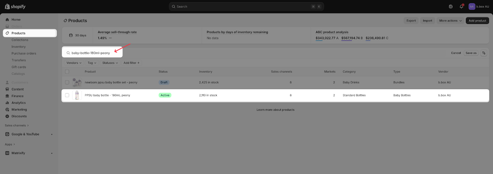 5 | While you have your Greedy List CSV file open, make sure you also have your client’s Shopify open. Copy the Handle from the sheet and paste in the Shopify Products search bar. Refer to the Title to check if you’ve clicked the correct product. | ![]() ![]() |
